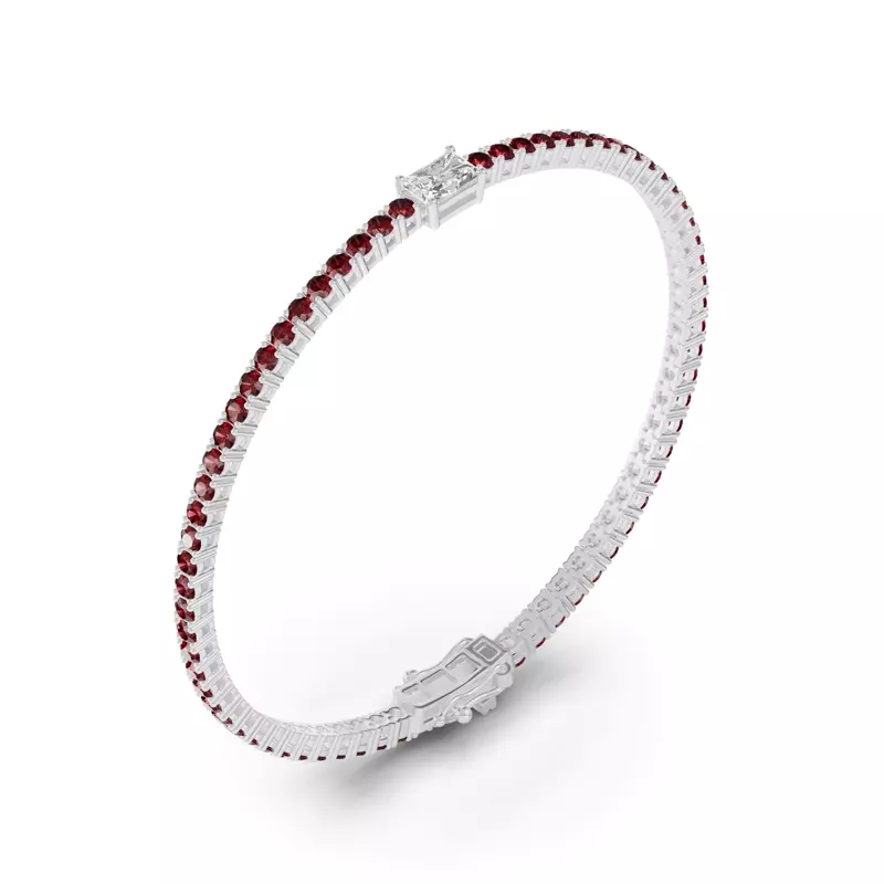 Vibrant rubies and a central radiant-cut lab diamond meet in a play of color and clarity. It’s the bracelet for someone who loves classic symmetry but craves a spark of individuality.