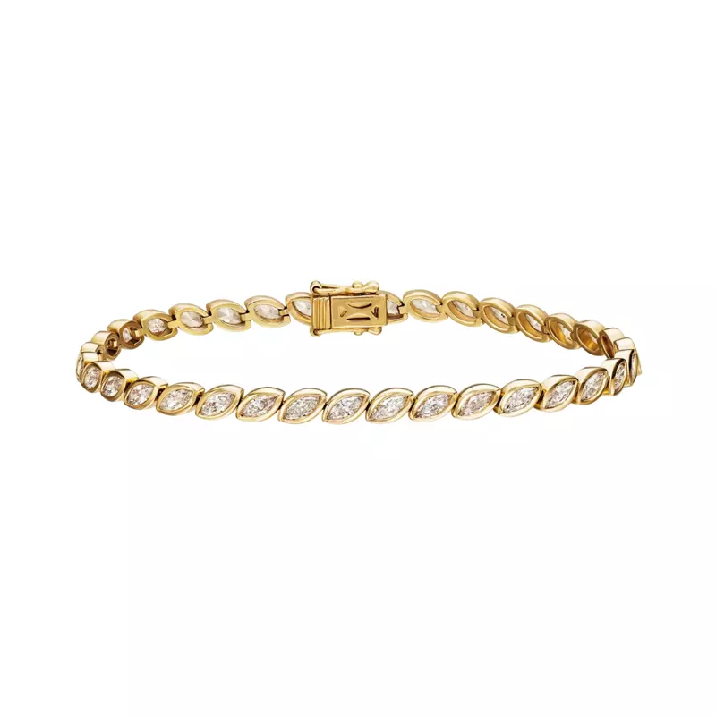 Angled marquise lab diamonds in sleek bezels transform tradition into motion through this diamond tennis bracelet.
