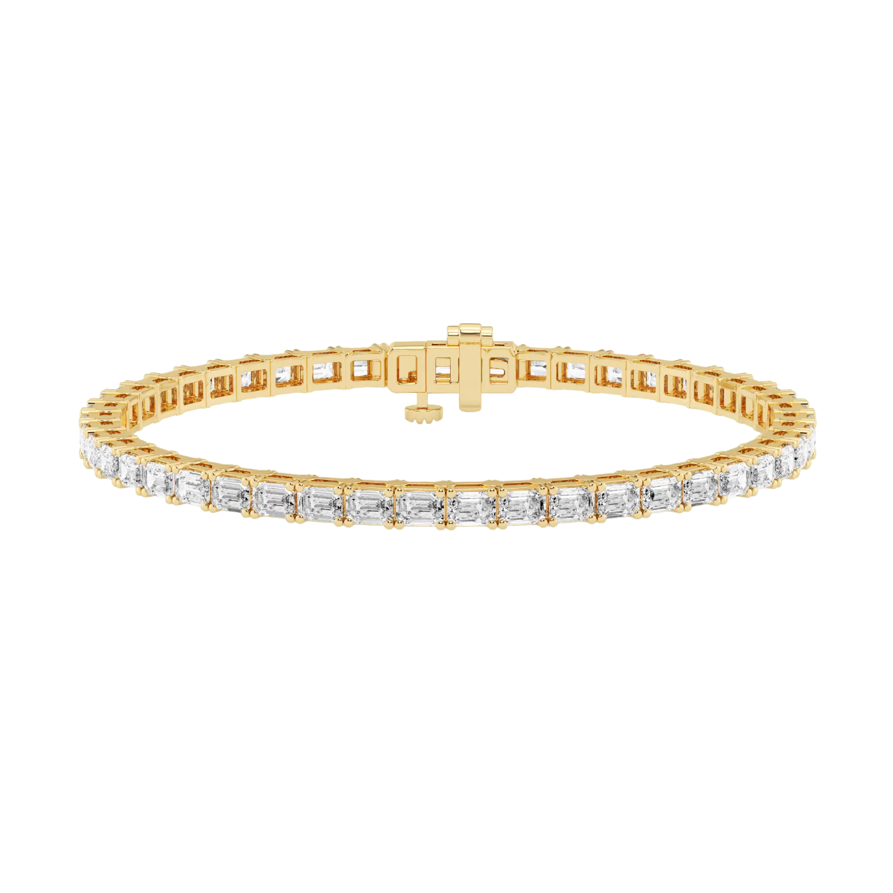 + Free ShippingThis is a jewelry Bracelet. This Bracelet has 14K Yellow Gold. This striking tennis bracelet showcases emerald-cut diamonds set in a distinctive east-west orientation.